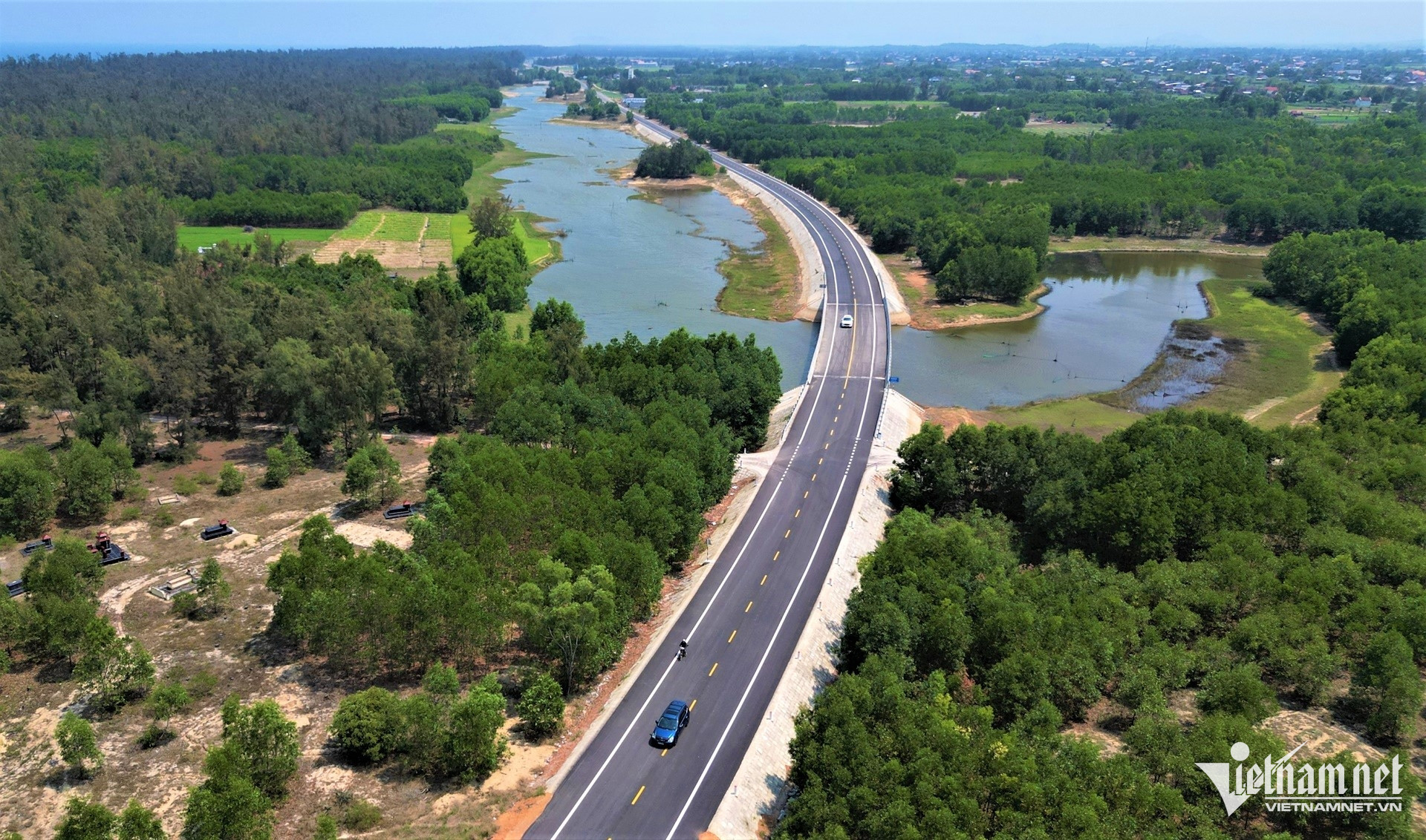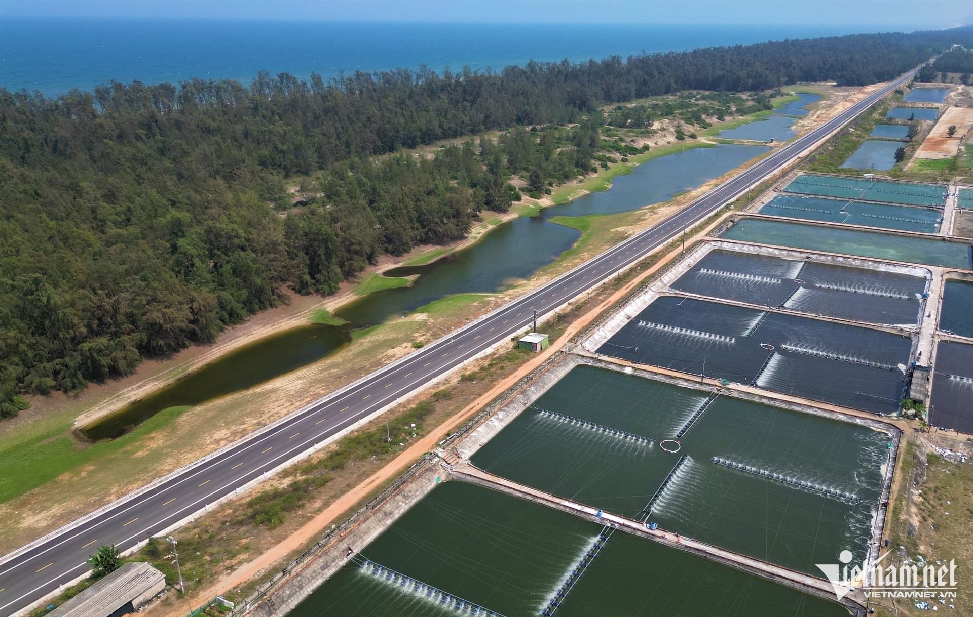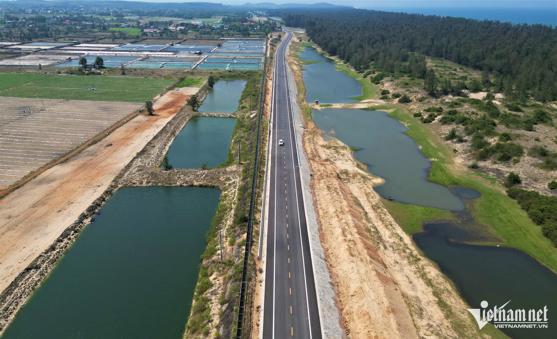 Tuyến đường ven biển uốn lượn qua sông, đầm; hai bên là rừng dương và khu vực sản xuất nông nghiệp, nuôi trồng thủy sản.