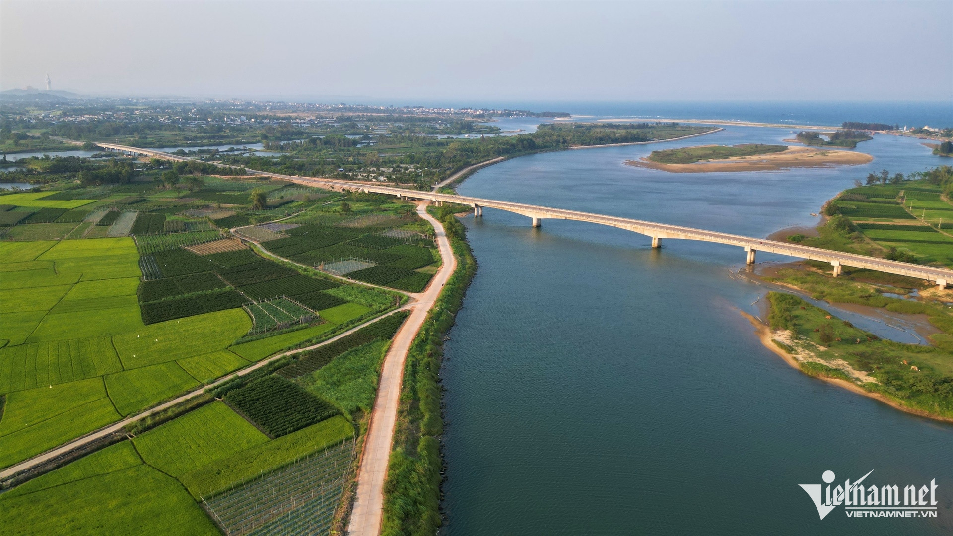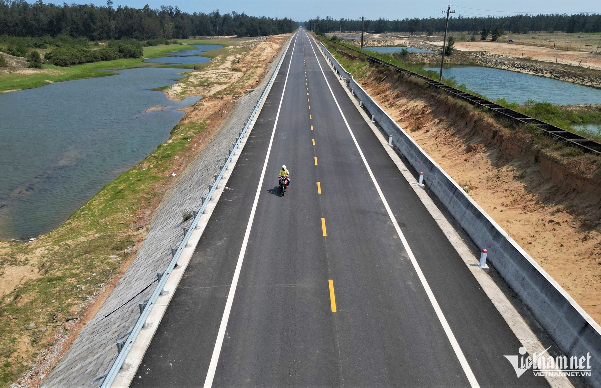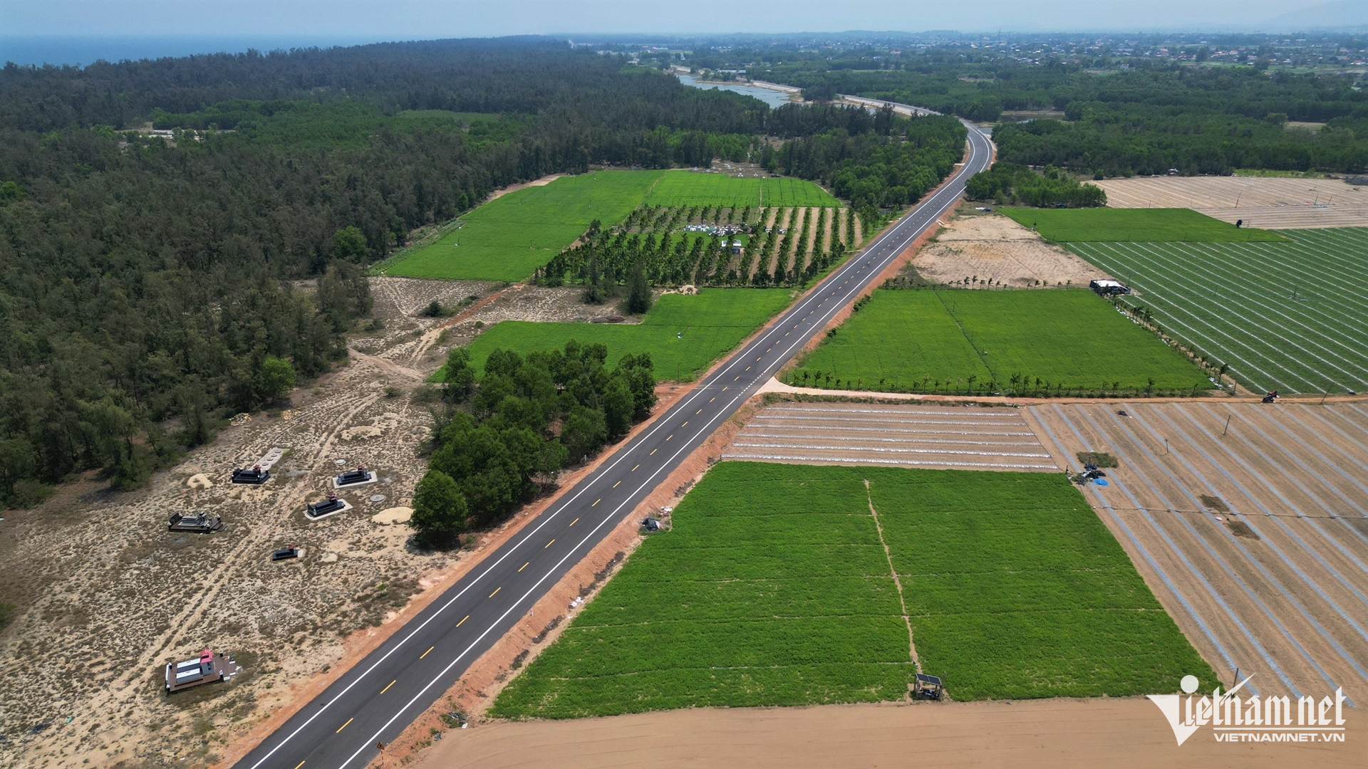 Tuyến đường ven biển uốn lượn qua sông, đầm; hai bên là rừng dương và khu vực sản xuất nông nghiệp, nuôi trồng thủy sản.